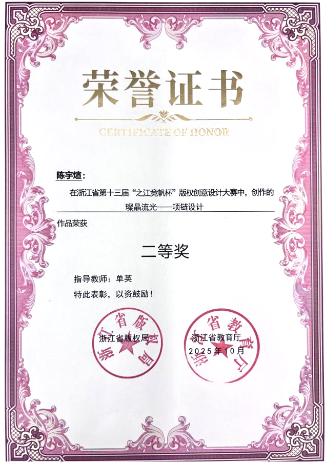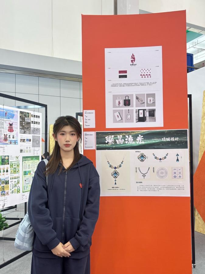 我院艺术设计专业学子积极响应赛事号召,在单英老师的精心指导下,陈宇煊同学凭借作品《璨晶流光 - 项链设计》在本科及高职院校学生中脱颖而出,最终斩获大赛二等奖。该作品深度契合赛事“民艺之美” 选题方向,从浙江民间文艺中汲取灵感,将传统美学元素与现代设计语言巧妙融合,在材质选择、造型设计与文化内涵表达上均展现出较高的专业水准,不仅彰显了创作者对民间文化的深刻理解,更体现了设计师将传统民艺与现代审美语境相结合的创新能力,得到评审专家的一致认可。