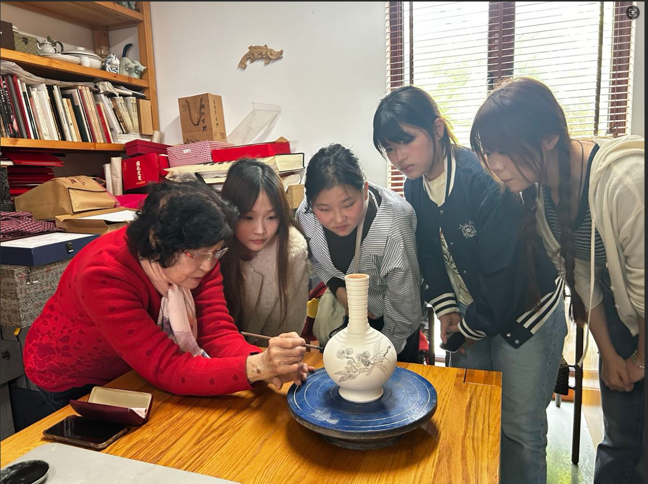 嵇锡贵大师从造型、釉色、装饰技法等方面逐一分析学生作品,指出改进方向,并现场演示了越窑青瓷刻花的核心技艺。她勉励同学们:“传统技艺的传承需要年轻人静下心、沉住气,把老祖宗的手艺学精、学透,更要结合时代审美进行创新。”大师的谆谆教诲让在场师生深受触动。