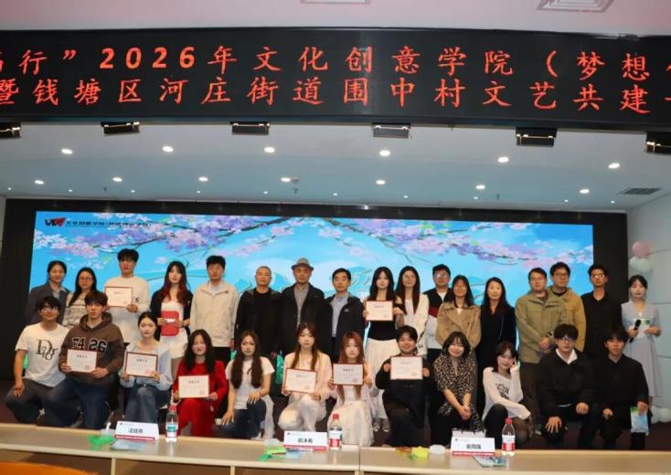 4月7日晚,文化创意学院(梦想创业学院)党总支与钱塘区河庄街道围中村党委党建共建专场文艺汇演暨学院2026年十佳歌手决赛在行政楼三楼报告厅举行。